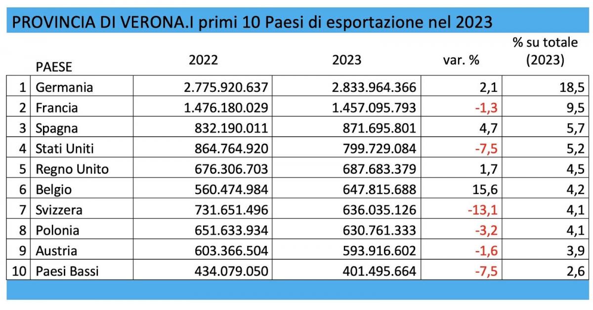 Quanto ai principali sbocchi delle merci scaligere, la Germania rimane il mercato più importante con un peso sul totale del 18,5% e un valore di 2,8 miliardi, in aumento del 2,1%. E’, invece, in calo il nostro secondo mercato, la Francia che quota 1,5 miliardi di euro (-1,3%) e pesa per il 9,5% sul dato complessivo. Aumentano Spagna (3° paese), Regno Unito (5°) e Belgio (6°). Sono in forte calo gli Stati Uniti, la Svizzera e i Paesi Bassi. Un lieve arretramento si registra per Polonia e Austria.